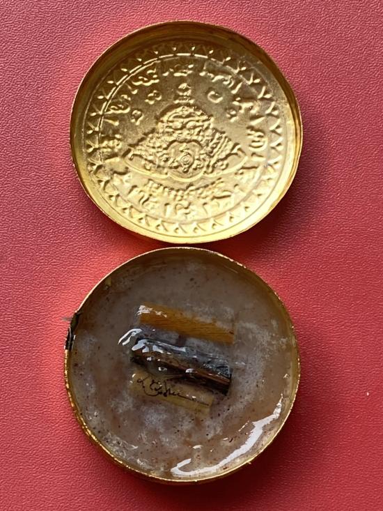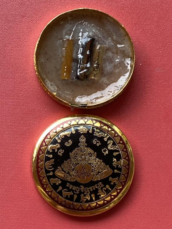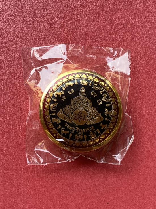 เคาะเดียวแดง สีผึ้งพระราหู รุ่น มงคลจักรวาล เนื้อ โลหะชุบทองลงยาสีดำขอบสีแดง ขนาด5ซม |