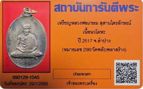เหรียญหลวงพ่อเกษม สุสานไตรลักษณ์ เนื้อนวโลหะ ปี 2517 จ.ลำปาง (วัดพลับพลาสร้าง) เลข 298 พร้อมกล่องเดิมพร้อมบัตรรับรองฯ