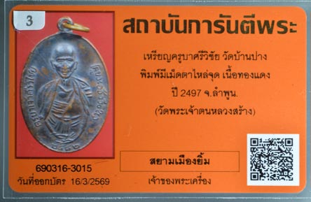 เหรียญครูบาศรีวิชัย วัดบ้านปาง ปี2497 วัดพระเจ้าตนหลวงสร้าง เคาะเดียว