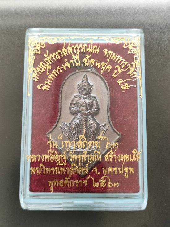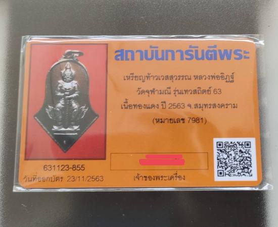 ท้าวเวสสุวรรณวัดจุฬามณี " รุ่นเทวสถิตย์ 63 " เนื้อทองแดง พิมพ์ใหญ่ (พิธีพุทธาภิเษก-เทวาภิเษก 5 วาระ) หลังยันต์นะเทวดา พร้อมบัตรรับรองการันตีพระ สภาพสวยงามมาก พร้อมกล่องเดิมจากวัด หมายเลข 7981