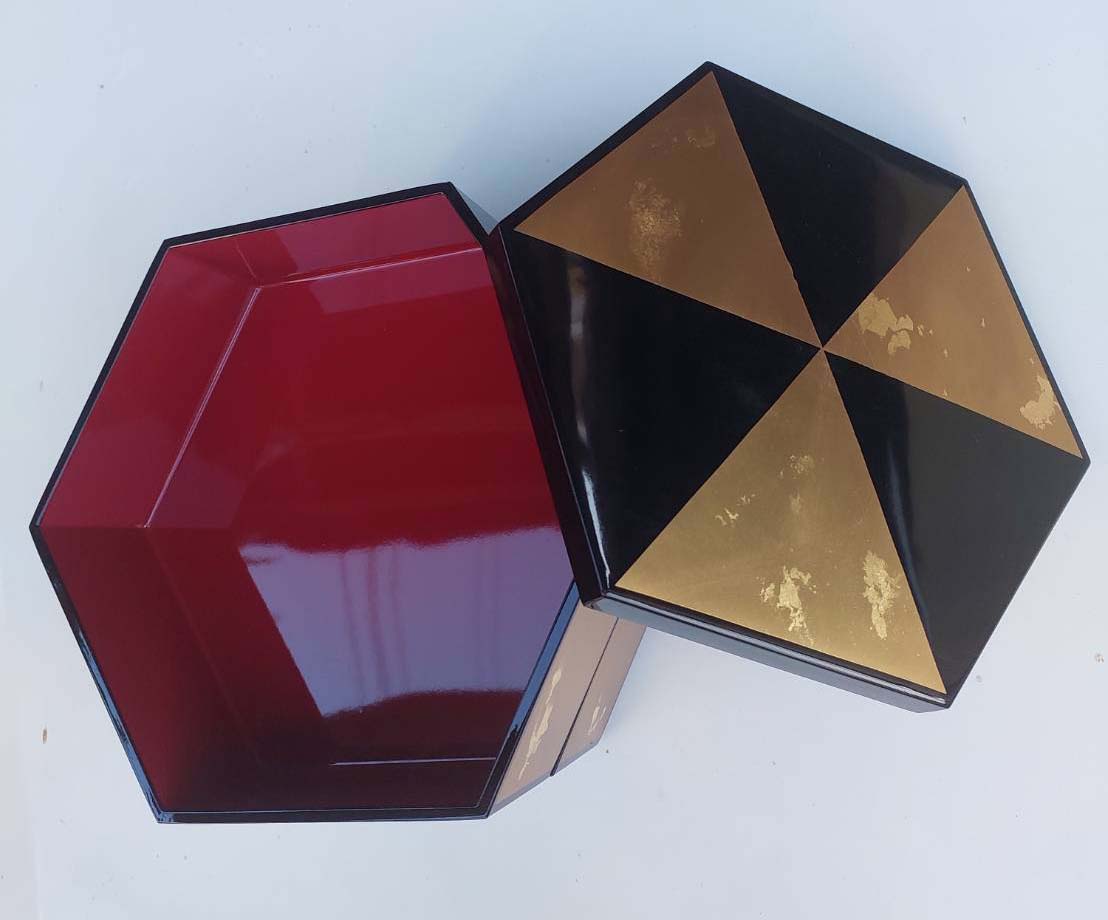 กล่องไม้เคลือบแล็กเกอร์สีดำและปืดทองคำ ทรงหกเหลี่ยม 2 ชั้น ของยังไม่ได้ใช้เก่าเก็บ ขนาด 8 นิ้ว สุง 6นิ้ว