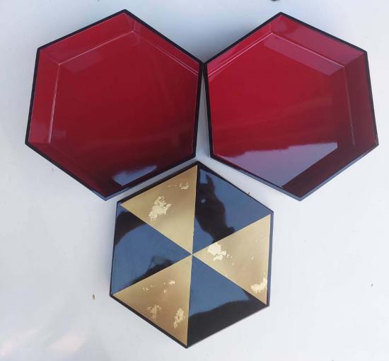 ***วัดใจ***กล่องไม้เคลือบแล็กเกอร์สีดำและปิดทองคำ ทรงหกเหลี่ยม 2 ชั้น ของยังไม่ได้ใช้เก่าเก็บ สวยๆ