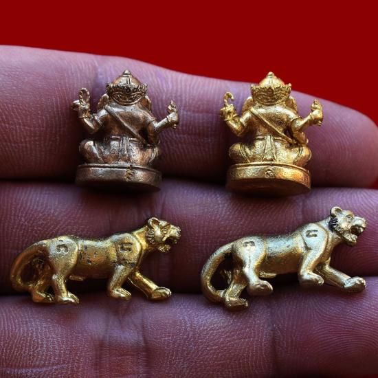 ชุด 4 องค์...พระพิฆเณศสมปรารถนา เนื้อทองผสม ปี 2550 หลวงปู่นิเวศน์ วัดทุ่งกระเจ็ด + พยัคฆ์บารมี เนื้อทองเหลือง ปี 2555 หลวงพ่อขันตี วัดหลวงบดินทร์เดชา พร้อมซองรูปเดิมจากวัด (ขนาดประมาณ 2 x 1.4 ซม.) + (พยัคฆ์ ขนาดยาวจากหัวถึงหางประมาณ 2.8 ซม.)