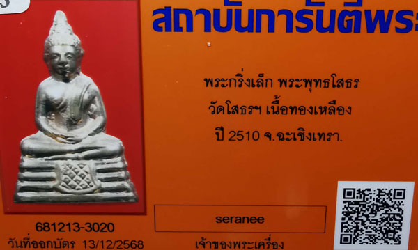 พระกริ่งเล็กพระพุทธโสธร วัดโสธรฯ เนื้อทองเหลือง กริ่งดัง ปี2510 จ.ฉะเชิงเทรา + บัตรG-pra สภาพสวยเดิมค่ะ