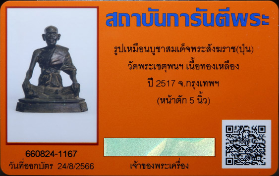 รูปเหมือนบูชา สมเด็จพระสังฆราช 5 นิ้ว วัดพระเชตุพนฯ ในหลวงเสด็จฯ เททอง ปี 2517 เนื้อทองเหลือง พิมพ์ดินไทย พร้อมบัตรรับรอง GPra.