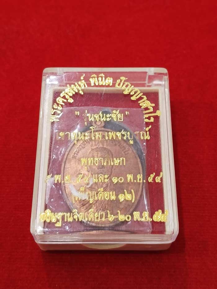 วัดใจเคาะเดียวแดง +++ เหรียญชนะชัย อ.ตี๋เล็ก สำนักปฏิบัติธรรมเขาสุนะโม จ.เพชรบูรณ์ กล่องเดิม เนื้อทองแดงหลังยันต์หูตัน