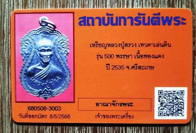เหรียญหลวงปู่สรวง เทวดาเล่นดิน รุ่น 500 พรรษา เนื้อทองแดง ปี 2535 จ.ศรีสะเกษ สภาพสวย พร้อมบัตรรับรอง ( หลวงปู่สรวง ท่านเป็นสหธรรมิกกับ หลวงปู่หมุน วัดบ้านจาน )