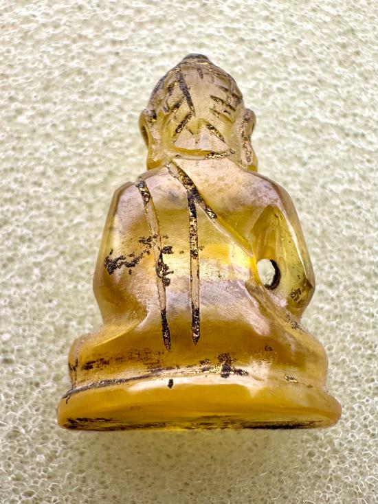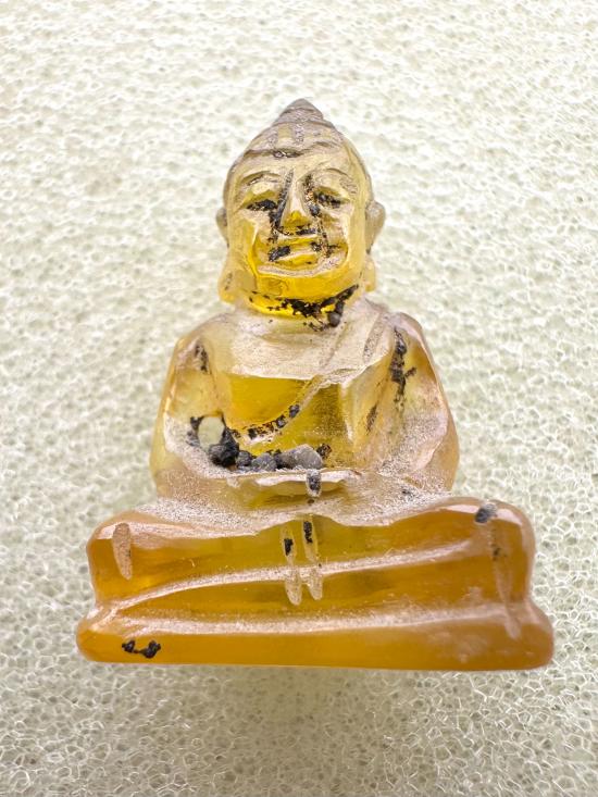 พระหินอัญมณีสีเหลือง กรุฮอด จังหวัดเชียงใหม่ เนื้อหินอัญมณี สีเหลือง ( บุศราคำ ) แกะเป็นพระเชียงแสน