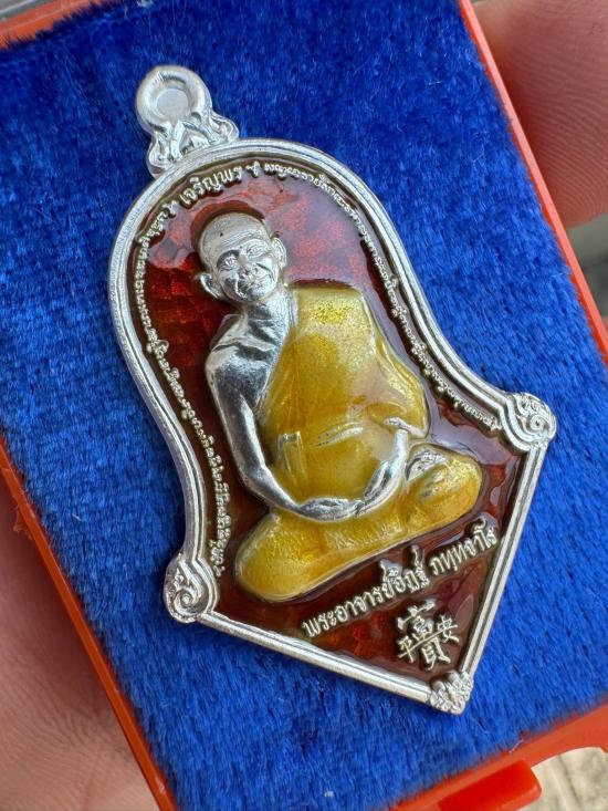 เหรียญรุ่นแรก รูปเหมือนทรงจำปี รุ่นเจริญพร หลวงพ่ออิฏฐ์ วัดจุฬามณี เนื้อเงินลงยาแดง