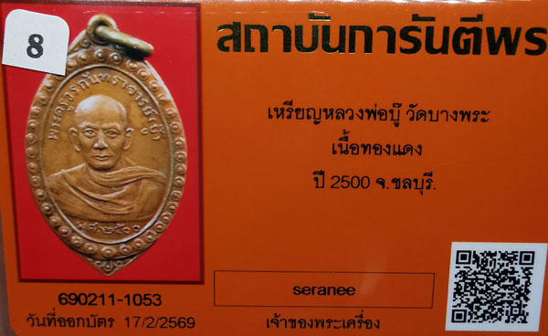 เหรียญหลวงพ่อบู๊ วัดบางพระ เนื้อทองแดง ห่วงเดิม ปี2500 จ.ชลบุรี + บัตรG-pra สภาพเดิมค่ะ |