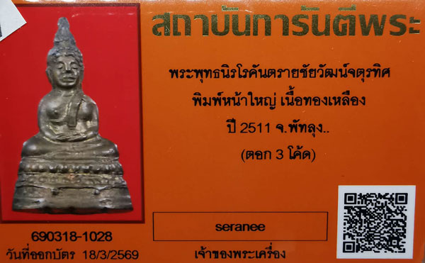 พระพุทธนิรโรคันตรายชัยวัฒน์จตุรทิศ พิมพ์หน้าใหญ่ เนื้อทองเหลือง ปี2511 จ.พัทลุง(ตอก3โค้ด) + บัตรG-pra สภาพเดิมค่ะ พระสภาพตามรูปทุกประการค่ะ