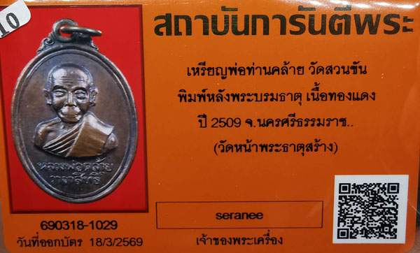 เหรียญพ่อท่านคล้าย วัดสวนขัน พิมพ์หลังพระบรมธาตุ เนื้อทองแดง ห่วงเดิม ปี2509 จ.นครศรีธรรมราช + บัตรG-pra สภาพเดิมค่ะ |