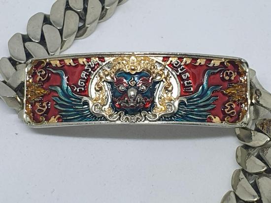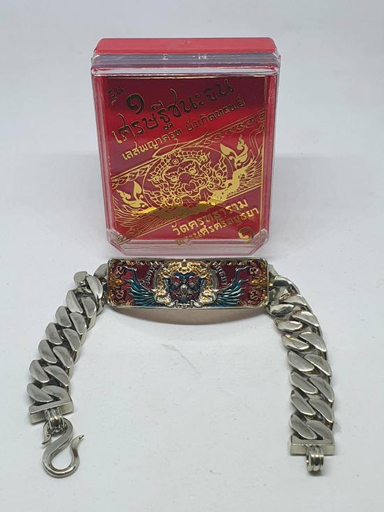 เลสพญาครุฑ บังเกิดทรัพย์ รุ่นแรก เศรษฐีชนะจน วัดครุฑธาราม อำเภอพระนครศรีอยุธยา จังหวัดพระนครศรีอยุธยา พิมพ์ใหญ่ (สำหรับผู้ชาย) ขนาด 7 นิ้ว น้ำหนัก 4 บาท เนื้ออัลปาก้า ชุบทองเครื่องทรง ลงยา |