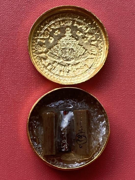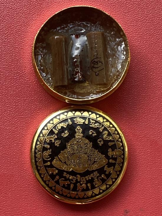 เคาะเดียวแดง สีผึ้งพระราหู รุ่น มงคลจักรวาล เนื้อ โลหะชุบทองลงยาสีดำขอบสีดำ ขนาด3.2ซม |