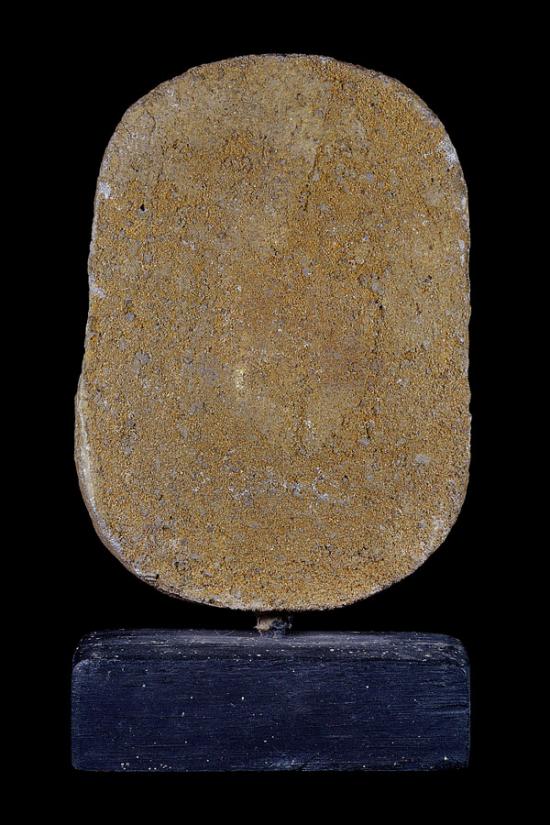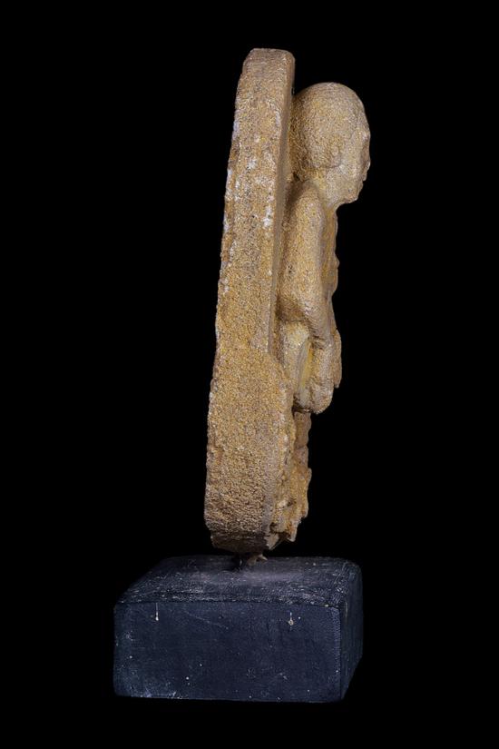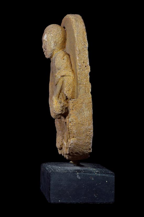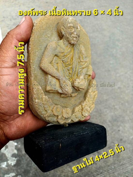 พระบูชาตั้งโต๊ะรูปเหมือนนูนต่ำ ( ฐานไม้ 4 x 2.5 นิ้ว , องค์พระ 6 x 4 นิ้ว , รวมสูง 7.5 นิ้ว ) เนื้อหินทราย ไม่ทราบที่ และ ปีจัดสร้าง