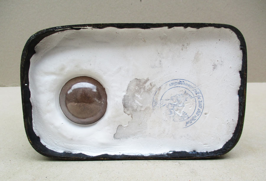 ภาพใต้ฐานขนาด 4.5 นิ้ว X 7.5 นิ้ว อุดปูน ฝังตลับบรรจุผงพุทธคุณ และปั๊มตราวัด ฯ