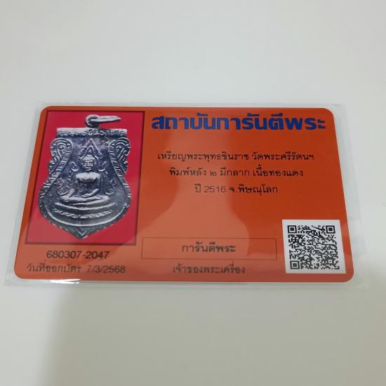 เหรียญพระพุทธชินราช วัดพระศรีรัตนฯ พิมพ์หลัง 2 มีกาก เนื้อทองแดง(ผิวขึ้นรุ้ง)ปี2516 จ.พิษณุโลก (พร้อมบัตรรับรองพระเครื่อง ของสถาบันการันตีพระ) |