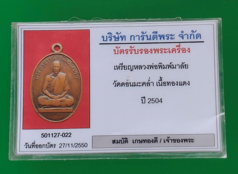 เหรียญรุ่นแรก หลวงพ่อพิมพ์มาลัย วัดหุบมะกล่ำ จ.ราชบุรี ปี 2504 เนื้อทองแดง |