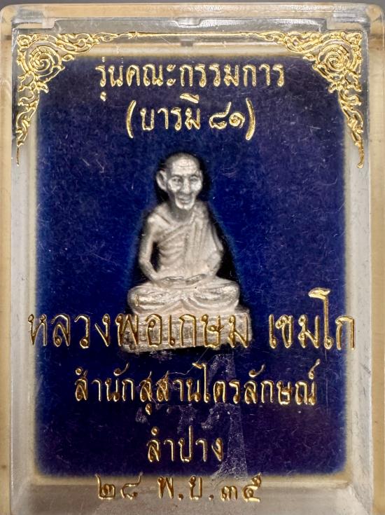 รูปหล่อลอยองค์ (รุ่นบารมี 81) เนื้อเงิน หลวงพ่อเกษม เขมโก แห่งสุสานไตรลักษณ์ จ.ลำปาง จัดสร้างในปี พ.ศ. 2535 โดยกรมตำรวจเนื่องในโอกาสวันเกิดครบ 81 ปี เป็นรุ่นยอดนิยมที่ออกแบบสวยงามเหมือนจริง มีพุทธคุณโดดเด่นด้านเมตตามหานิยม คงกระพัน และโชคลาภ อธิษฐานจิตปลุกเสกอย่างเต็มที่ ถือเป็นพระดีมีคุณค่าน่าสะสม