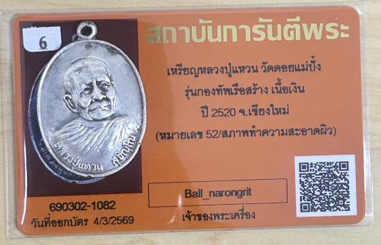 เปิดวัดใจครับ เหรียญหลวงปู่แหวน วัดดอยแม่ปั๋ง รุ่นกองทัพเรือสร้าง เนื้อเงิน ปี 2520 จ.เชียงใหม่ หมายเลข 52 *สภาพบัตรลงทำความสะอาดผิว