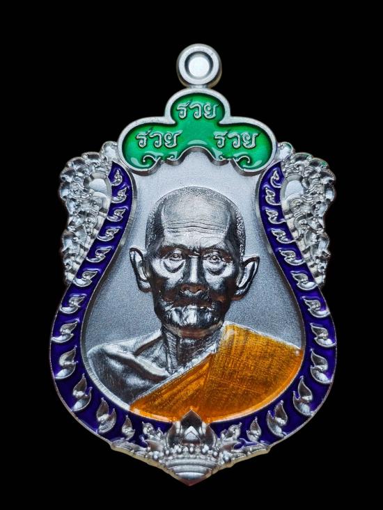หลวงปู่ฝั้น ปสาโท วัดหน้าผา จ.เพชรบูรณ์ (เนื้ออาบเงิน ลงยาขอบม่วง บนเขียว ลงยาจีวร เลข2) |
