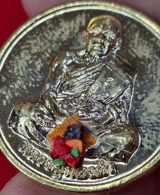เหรียญโภคทรัพย์ หลวงพ่อทองดำ วัดท่าทอง จ.อุตรดิตถ์ เป็นเหรียญกะไหล่ทองและตอกโค๊ตที่ด้านหน้าเหรียญ สำหรับเหรียญนี้พิเศษตรงที่ติดแร่เหล็กไหล+จีวร+ไหม+เส้นเกศา แบบนี้หายากมากๆเลยนะครับ |