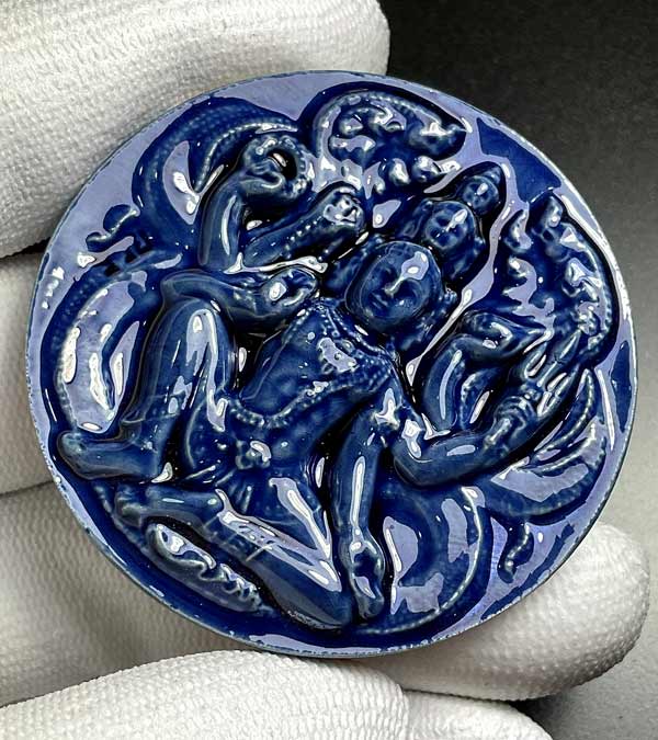 จตุคามรามเทพ รุ่น เก้าหน้ามหาโชค ( วัดอ้ายเขียว ) ปีพ.ศ. ๒๕๕๐ ขนาด 5.3 ซ.ม เนื้อกระเบื้องเคลือบน้ำเงิน โค้ค *รวย* สภาพสวยพร้อมกล่องเดิม