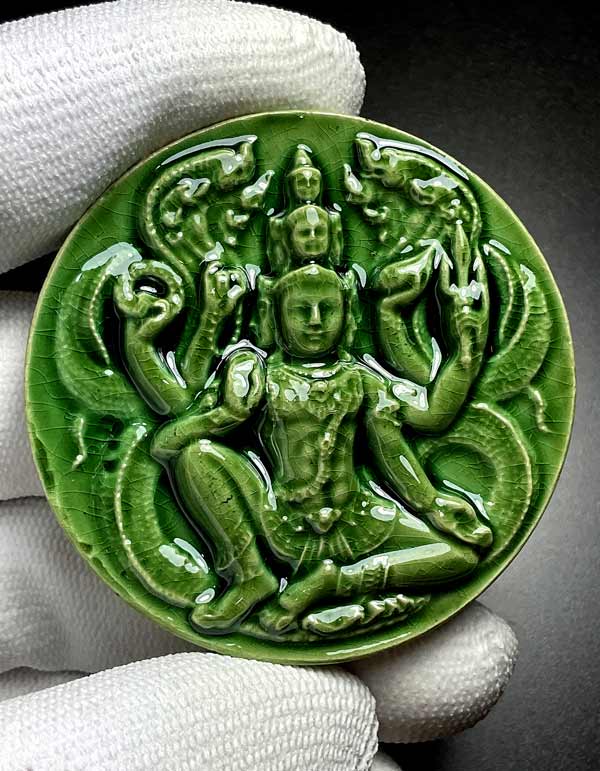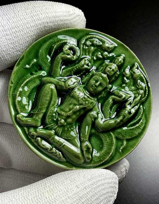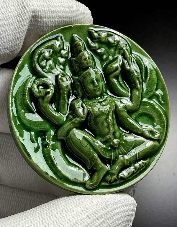 จตุคามรามเทพ รุ่น เก้าหน้ามหาโชค ( วัดอ้ายเขียว ) ปีพ.ศ. ๒๕๕๐ ขนาด 5.3 ซ.ม. เนื้อกระเบื้องเคลือบเขียว โค้ด รวย* สภาพสวยพร้อมกล่องเดิม