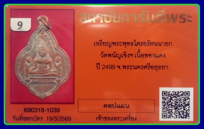 บัตรการันตี หายาก-700-เหรียญพระพุทธไตรรัตนนายก วัดพนัญเชิง อยุธยา พศ.2499 (หน้ารุ่น2) |