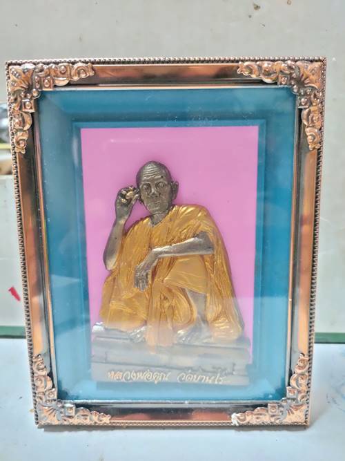 แผ่นกรอบรูปบูชา หลวงพ่อคูณ ปริสุทโธ รุ่น คูณเงินคูณทอง ออกวัดบ้านไร่ ปี 2536 พิมพ์นั่งเท่ห์ เนื้อ ซิลิก้าทาทอง 5x6นิ้ว เคาะเดียวแดง