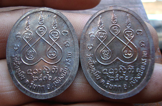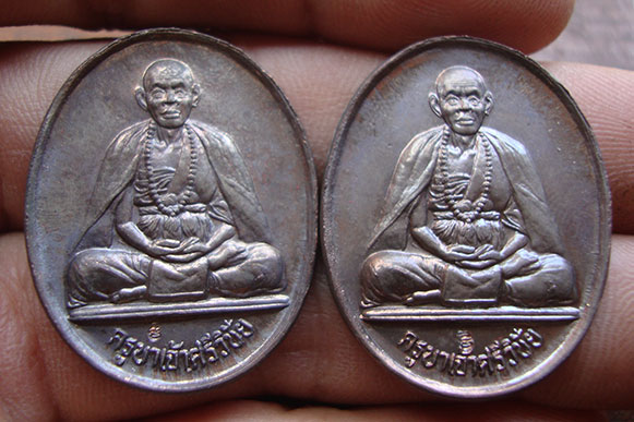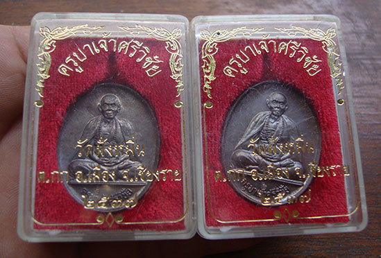 เหรียญ เนื้อนวโลหะ รุ่นแรก ครูบาศรีวิชัย วัดฝั่งหมิ่น เชียงราย ปี2536 ตอกโค๊ต กล่องเดิม ( 2 เหรียญ) สวยครับ