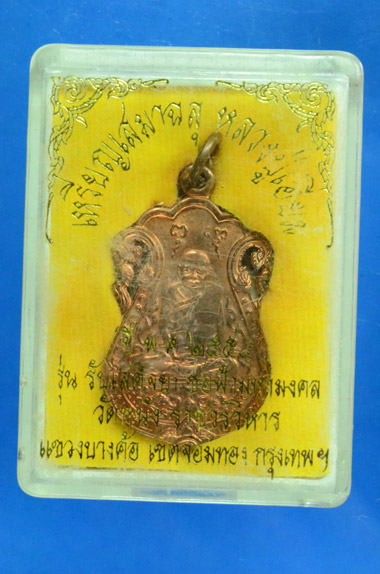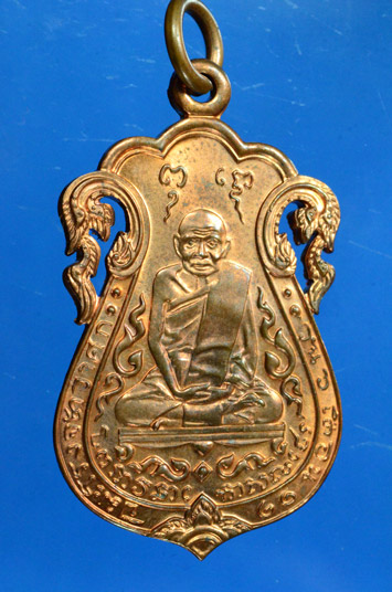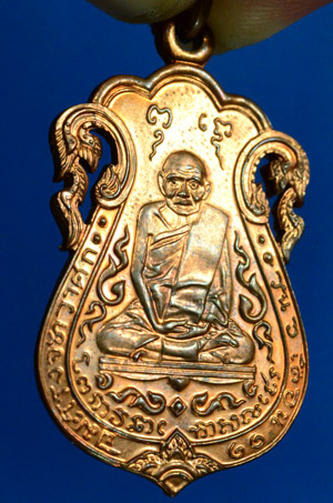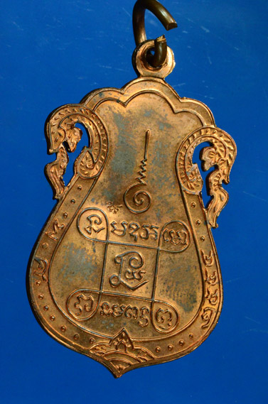 เหรียญเสมาฉลุ หลวงปู่เอี่ยม วัดหนัง หลังยันต์สี่ รุ่นรับเสด็จยกช่อฟ้ามหามงคล เนื้อทองแดง ปี 2554 กทม แกะพิมพ์จากเหรียญรุ่นแรก |