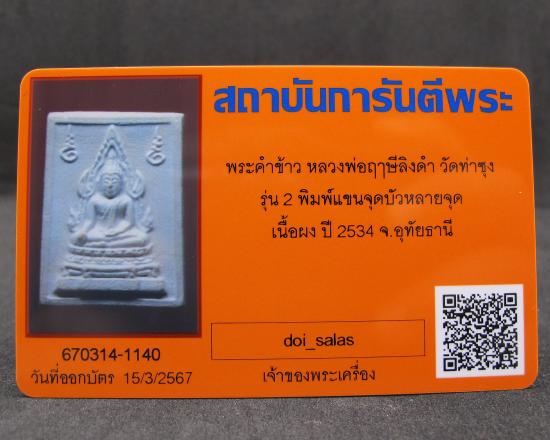 พระคำข้าว รุ่น2 พิมพ์แขนจุดบัวหลายจุด หลวงพ่อฤาษีลิงดำ วัดท่าซุง พร้อมบัตรรับรอง