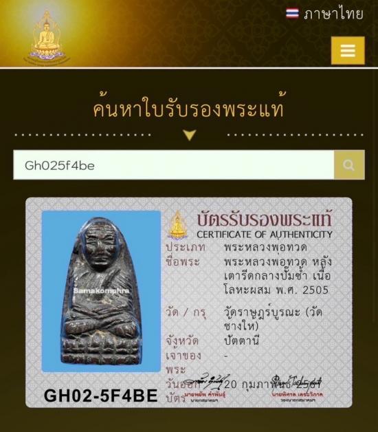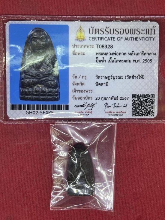 พระหลวงพ่อทวด วัดช้างให้ หลังเตารีด พิมพ์กลางปั๊มซ้ำ ปี 2505 สภาพสวย สวยสมบูรณ์มากๆ เส้นหน้าผาก หน้าตาติดจมูกเต็ม 64 ปี ผิวเดิมๆ ไม่เช็ดไม่มีล้าง ผิวคราบดินเบ้าเดิมๆ ตามซอกบัว หน้าแข้ง ริ้วจีวร ครบสูตร มีร่องรอยการปั๊มซ้ำ รอยปั๊มกระแทกรอยแยกชัดเจน ทำให้เห็นครีบเนื้อยื่นออกมา เนื้อแดงกลับดำหายากสุดๆ ผิวโลหะตึงๆเส้นปั๊มเห็นได้ชัดเจนพระมีมิติที่สมบูรณ์ แท้ดูง่าย จบทุกสายตา แท้ทุกสถาบัน เป็นเตารีดกลาง ที่ได้รับความนิยมสูงสุด ของพระหลวงพ่อทวด มาพร้อมบัตรสมาคมผู้นิยมพระเครื่องพระบูชาไทย 1 ใบ