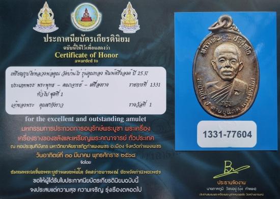 เหรียญหลวงพ่อคูณ รุ่นคูณทอง เนื้อนวโลหะ ปี 2537 พร้อมใบประกาศ ติดรางวัลที่ 1 งานจังหวัดกำแพงเพชร (งานสมาคม)