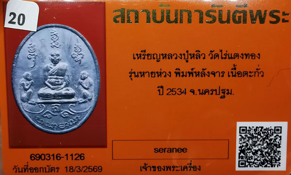 เหรียญหลวงปู่หลิว วัดไร่แตงทอง รุ่นหายห่วง พิมพ์หลังจาร เนื้อตะกั่ว ปี2534 จ.นครปฐม + บัตรG-pra สภาพเดิมค่ะ |