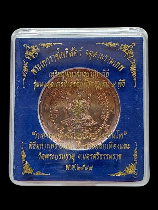 พระเทวราชโพธิสัตว์ จตุคามรามเทพ เหรียญมหาจักรปาฏิหาริย์ รุ่นมงคลบารมี ครอบฟ้าคลุมดิน 9 พิธี กองทุนหลวงปู่ปาน โสนันโท พิธีมหาพุทธาภิเษก ณ ศาลหลักเมือง และวัดพระบรมธาตุ จ.นครศรีธรรมราช พ.ศ 2549 เหรียญขนาดใหญ่ 3.5 ซม. ตอกโค๊ต รันหมายเลข ยังอยู่ในซีลเดิมมีกล่องครบค่ะ |
