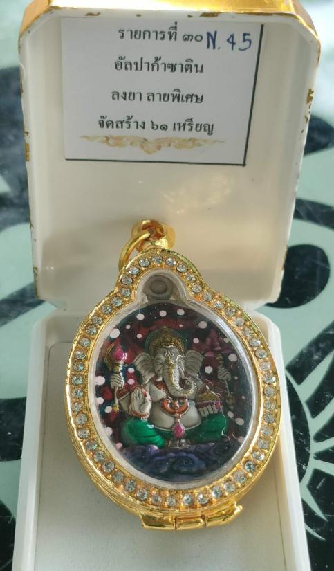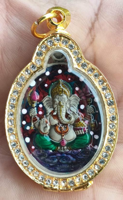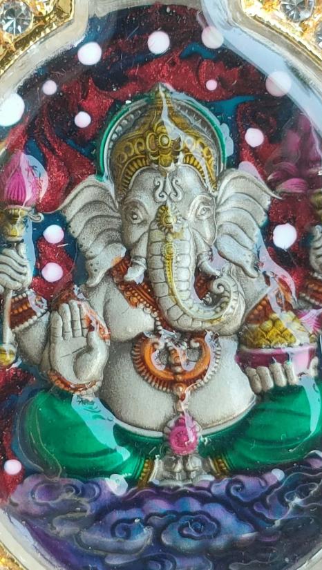 เหรียญพระพิฆเนศรุ่นพิณเณตร รวย รวย หลวงปู่ศิลา อุปถัมภ์สร้างโบสถ์มหาอุตม์ วัดบ้านโนนเดื่อ จ.ร้อยเอ็ด เนื้ออัลปาก้าซาติน ลงยาแกแล็คซี่ เลี่ยมกรอบชุบทองอิตาลี หมายเลข ๔๕ พร้อมกล่อง ผลรวมได้๙ ลงยาสวยมากคับ |