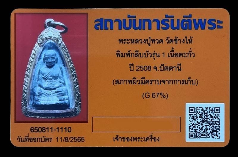 เหรียญกลีบบัว รุ่น 1 ปี 2508 เนื้อตะกั่ว หลวงปู่ทวด วัดช้างให้ จ.ปัตตานี หลวงปู่ทิมปลุกเสก เลี่ยมทองพร้อมใช้