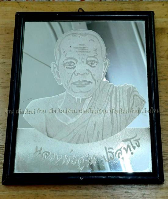 กระจกเงากัดลาย รูปเหมือนครึ่งองค์ หลวงพ่อคูณ ไม่ทราบที่ และ ปีจัดสร้าง ( ขนาด 9 x 7.5 นิ้ว )