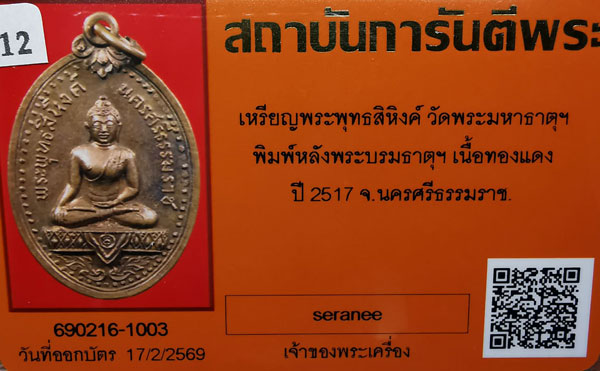 เหรียญพระพุทธสิหิงค์ วัดมหาธาตุฯ พิมพ์ใหญ่ เนื้อทองแดง ห่วงเดิม ปี2517 จ.นครศรีธรรมราช + บัตรG-pra สภาพสวยเดิมค่ะ สภาพตามรูปทุกประการค่ะ