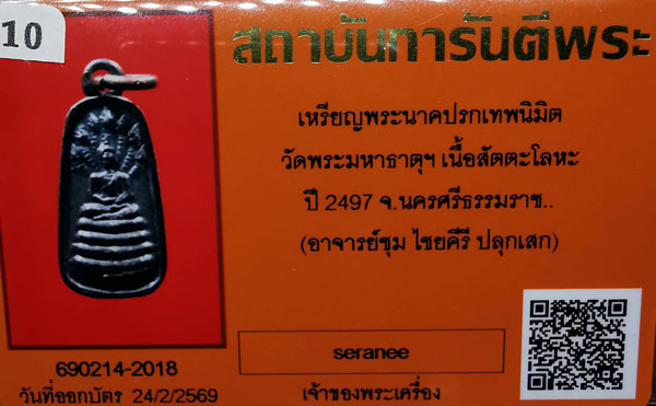 เหรียญพระนาคปรก อาจารย์ชุม ไชยคีรี ปี2497 เนื้อสัตตะโลหะ ห่วงเดิม จ.นครศรีธรรมราช + บัตรG-pra สภาพสวยเดิมค่ะ |