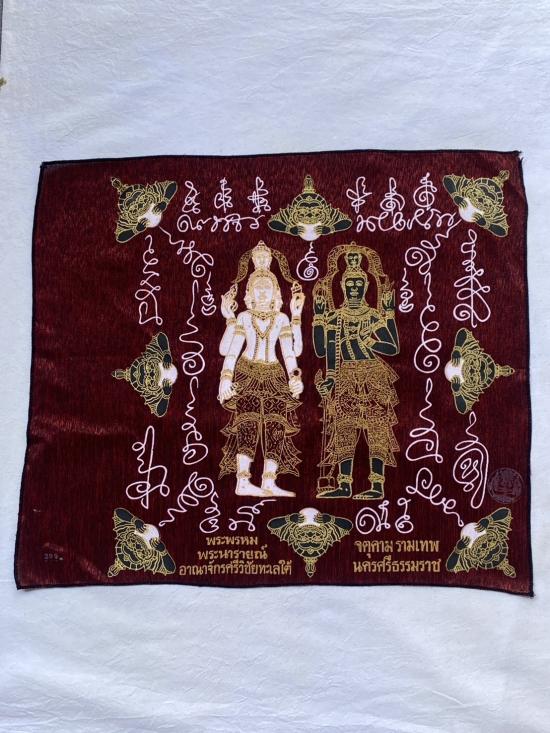 เคาะเดียวแดง ผ้ายันต์ พระพรหม พระนารายณ์ มิ่งมงคล รุ่นมงคลจักวาล ขนาด40/40ซม สีแดง มีตราประทับ-มีรันเลข |