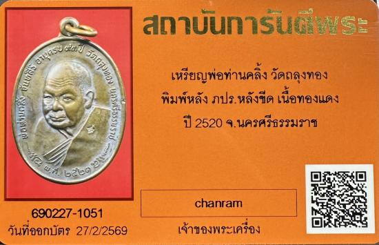 เหรียญพ่อท่านคลิ้ง วัดถลุงทอง พิมพ์หลัง ภปร.หลังขีด เนื้อทองแดง ปี 2521 จ.นครศรีธรรมราช (พร้อมบัตรรับรองฯ) |