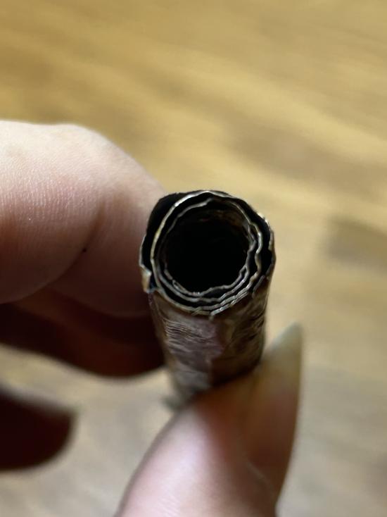 ตะกรุดทองแดงเก่า ข้างในมีรอยจาร ไม่ทราบที่