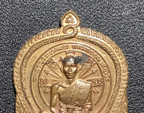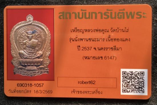 เหรียญหลวงพ่อคูณ วัดบ้านไร่ รุ่นนั่งพานชนะมาร ปี 2537 เนื้อทองแดง หมายเลข 6147 พร้อมกล่อง+บัตรรับรองครับ