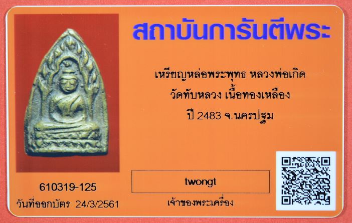 เหรียญหล่อพระพุทธ พิมพ์หน้าใหญ่ หลวงพ่อเกิด วัดทับหลวง เนื้อทองเหลือง ปี 2483 จ.นครปฐม พร้อมบัตรรับรอง หลวงพ่อเดิม วัดหนองโพธิ์ร่วมปลุกเสก เคาะเดียวแดง
