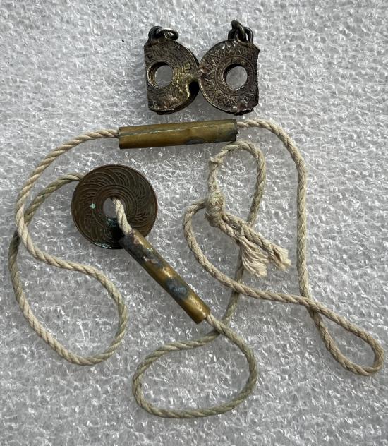 เหรียญรูแข้งสิงห์เนื้อเงิน 10สตางค์ ปี2484 (2เหรียญ) แต่พาไปทำพิธีผ่าครึ่ง เชื่อมเหรียญและเชื่อมห่วง + เหรียญรูทองแดงธรรมดาพร้อมเชือกมีตะกรุด