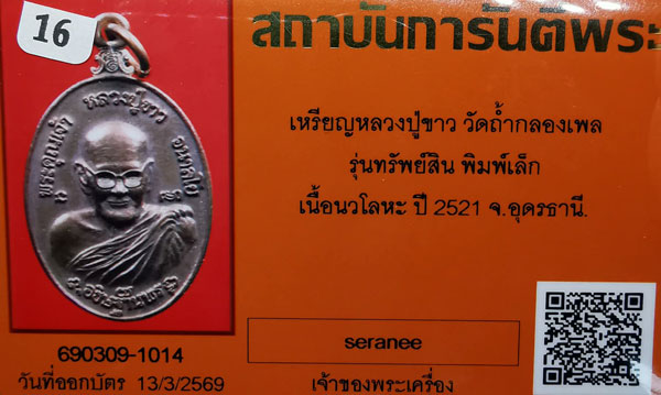 เหรียญหลวงปู่ขาว วัดถ้ำกลองเพล รุ่นทรัพย์สิน พิมพ์เล็ก เนื้อนวโลหะ ห่วงเดิม ปี2521 จ.อุดรธานี + บัตรG-pra สภาพสวยเดิมค่ะ |