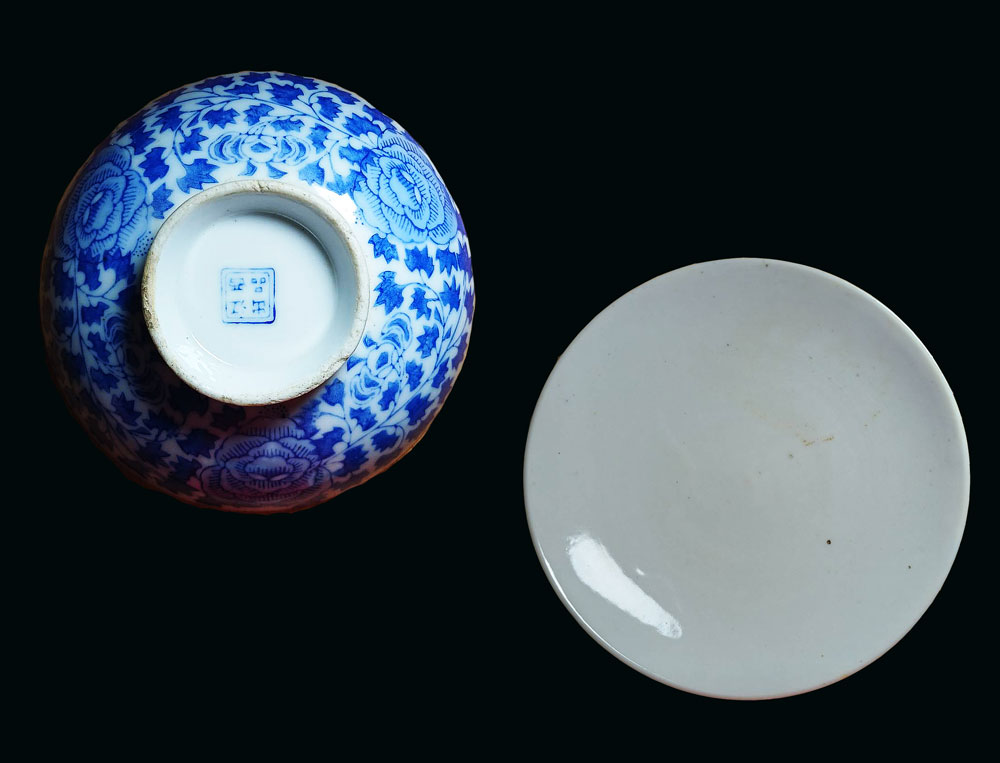โถใสแป้งเจิมเบญจรงค์สมัยอยุธยาขนาดเสันผ่านศูนย์กลาง 6 ซ.ม.สูง 5 ซ.ม. ไม่มีฝาปิด --- ฝาถ้วยลายดอกไม้เถา สมัยอยุธยา ขนาดเส้นผ่านศูนย์กลาง 11 ซ.ม.มีแต่ฝา